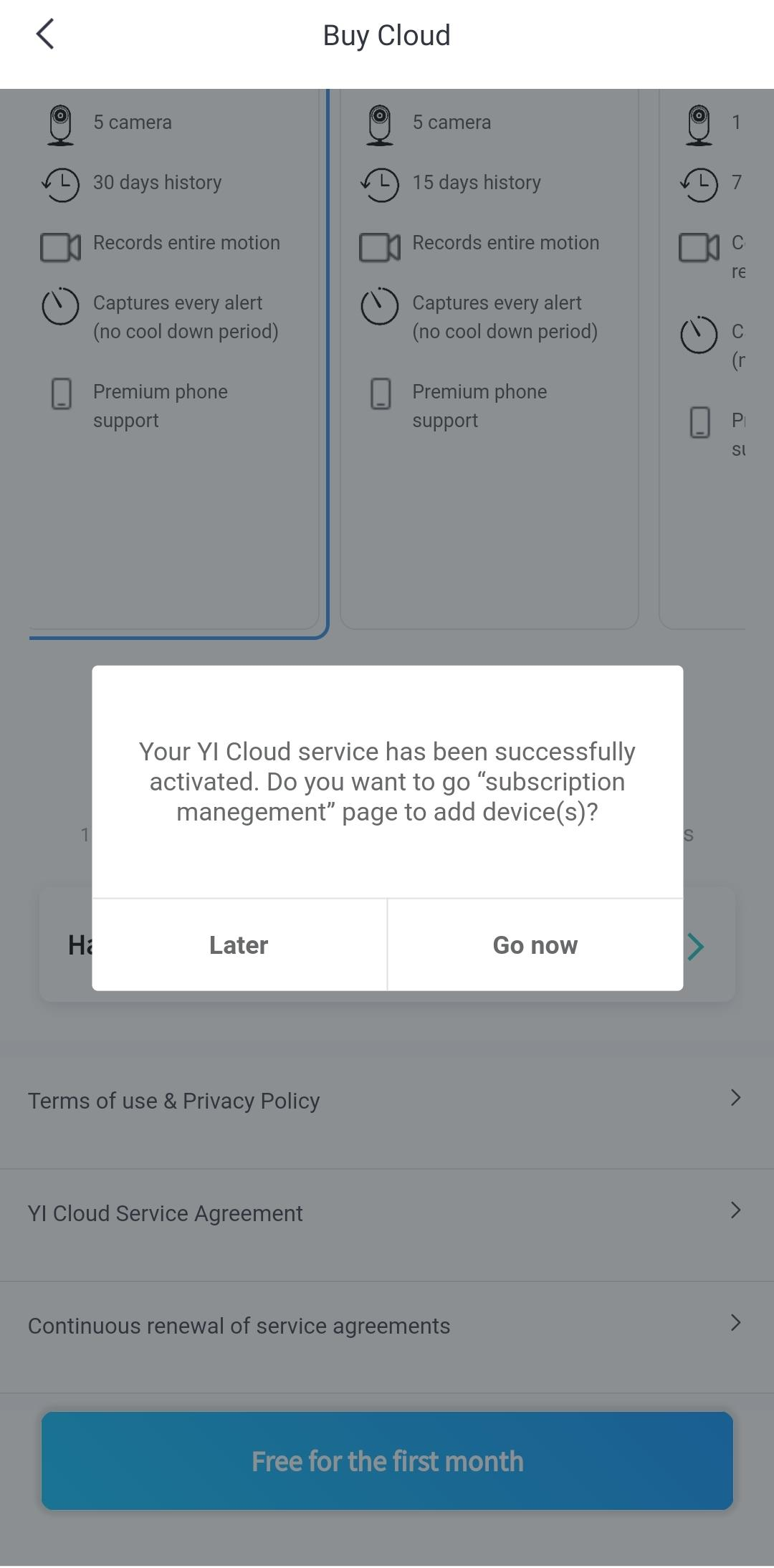 5. Pop-up message to confirm that you successfully activate the Cloud code. Click Go Now to view your Cloud subscription.