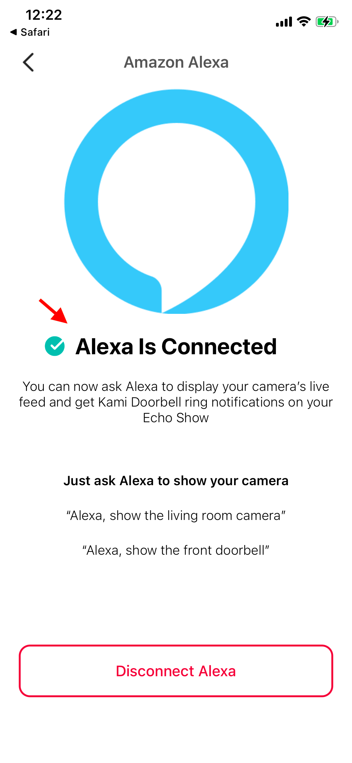 8) After signing into your Amazon Alexa account, the app will display, “Alexa is Connected”.